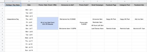 When building out your calendar, dates will list down in the first left column, and events will be listed in the second column. This includes product launches, promotions, holidays, and any other event relevant to your business.