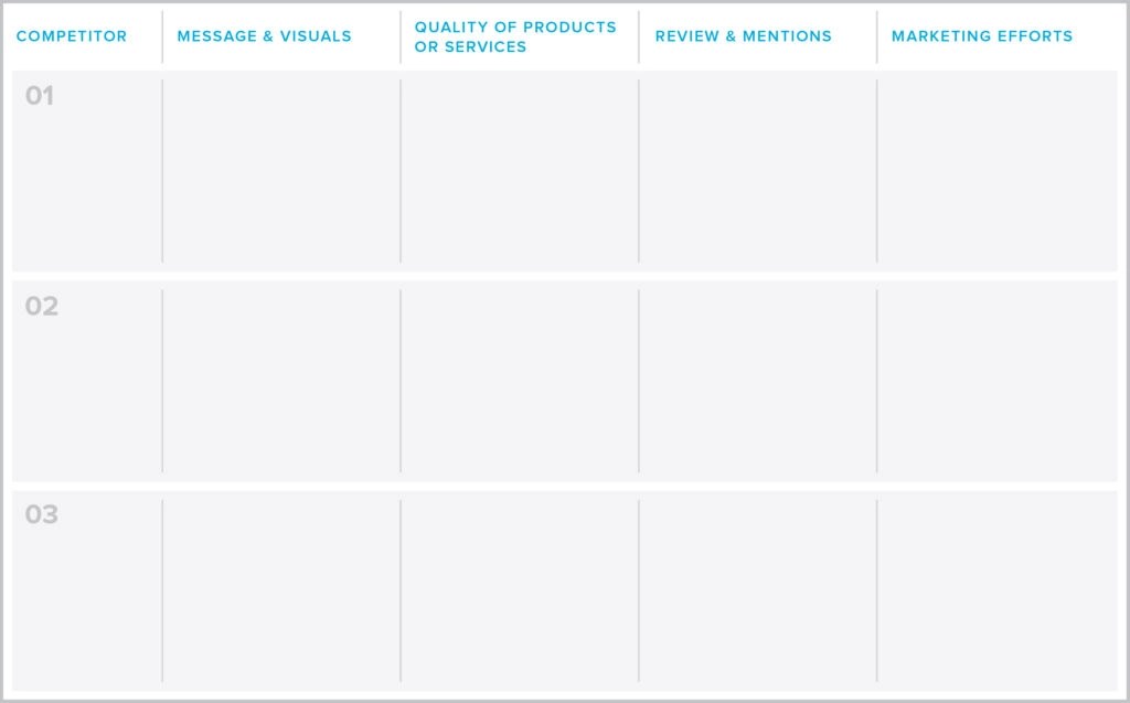 Competitor research is a key element of your own brand development. Start by creating a brand competitor spreadsheet for comparison. You can use Google Sheets, Excel, or even just a notebook.