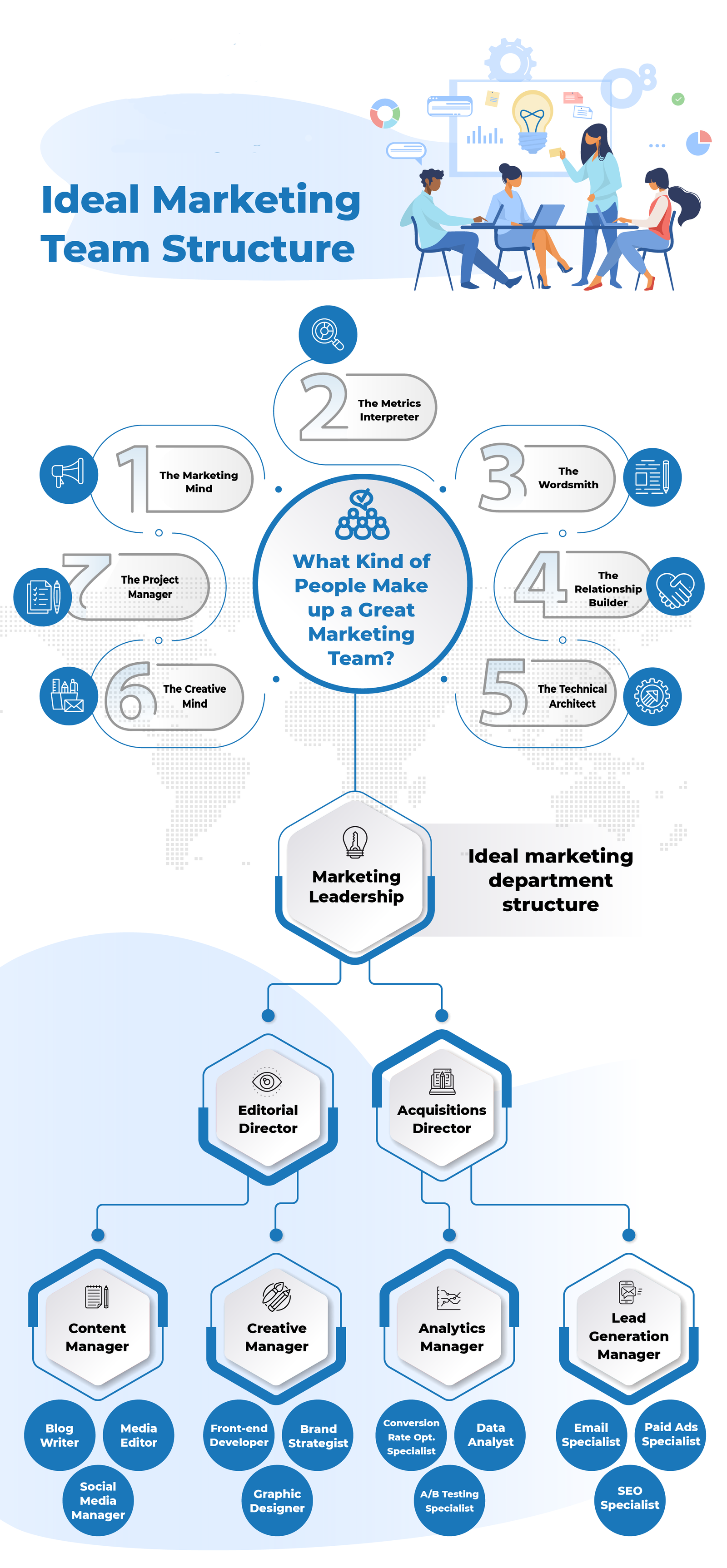 It is important to nail this point down: perfection is in the eye of the beholder. Whatever works best for some companies might not be what works for others. That said, there are general ideas of how a marketing team should be structured: