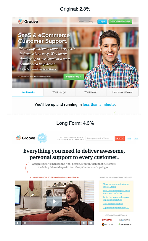 One of Groove’s landing pages converted at 2.3 percent. Conversions increased by 4.7 percent after they tweaked and tested a new landing page.